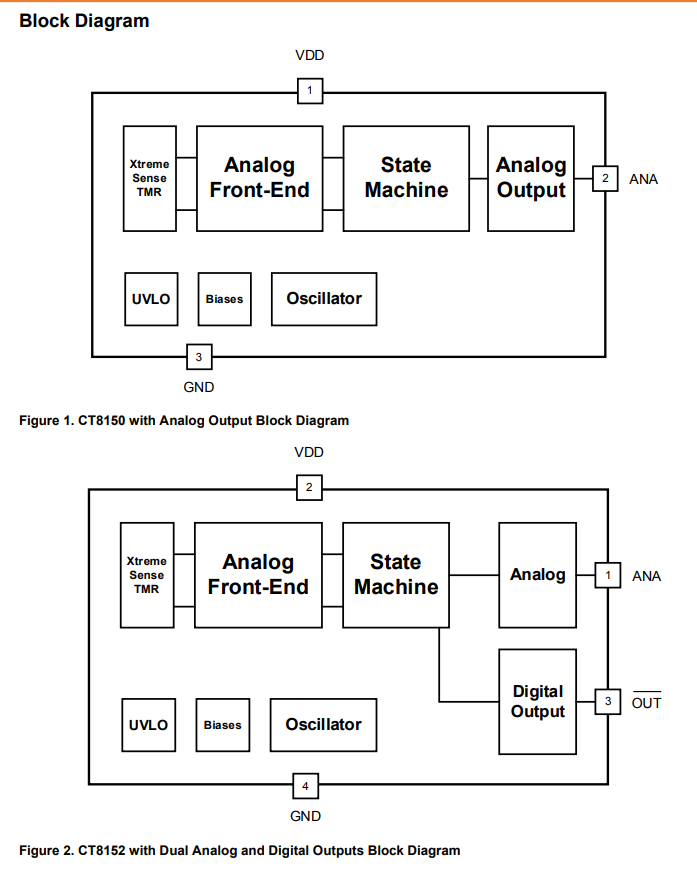 The CT815x XtremeSense TMR family offers ultra-low power consumption and high sensitivity for battery-powered applications. These omnipolar TMR sensors provide linear analog output and are available in compact LGA and SOT23 packages. The CT8152 offers dual analog and digital outputs.