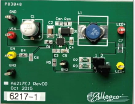This evaluation board is used to demonstrate the operation and performance of the Allegro A6217 constant-current buck regulator LED driver.