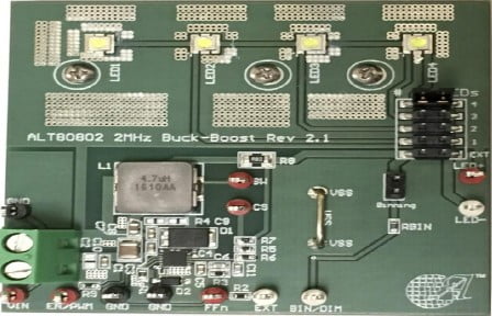 The ALT80802 Evaluation Board is designed to help system designers evaluate the operation and performance of the ALT80802 Wide Input Voltage, Adjustable Frequency, Buck-Boost or Buck, 2 Amp LED Driver. This board is configured in a buck-boost configuration, which allows operation while driving LED strings with a forward voltage drop below, equal to or higher than the input voltage.