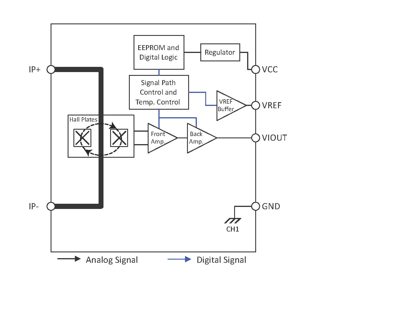 - High accuracy achieved with 6 mV maximum offset voltage over temperature and non-radiometric operation with VREF output, and differential sensing for high immunity to magnetic fields