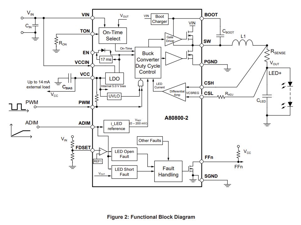 - 55Vin rating – Can be used on traditional 12-V automotive, and 24-V trucks, and systems using a pre-boost supply followed by the A80800-2 to drive a high number of LEDs