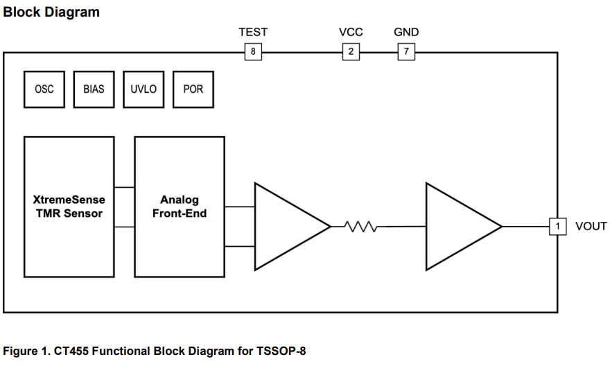 The CT455 offers high-accuracy contactless XtremeSense TMR current sensing with a 1MHz bandwidth, programmable gain, and low noise performance. Available in both SOIC-8 and TSSOP-8 packages.