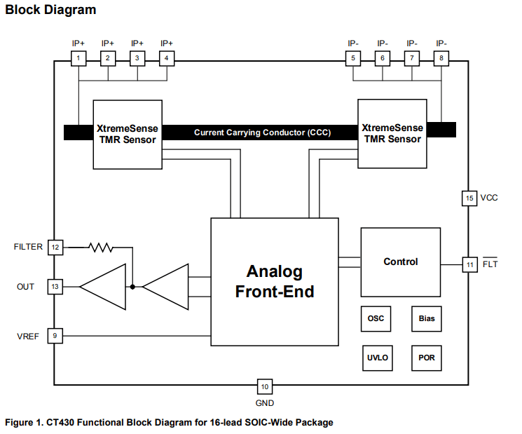 CT430 (VCC = 5.0 V) は、超低ノイズ、300nsの高速応答時間、5kVの絶縁、設計を簡素化する内蔵の通電導体 (CCC) により、高精度の電流測定機能を提供します。過電流検出機能を内蔵しており、システムの保護が強化されています。