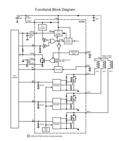 A2550 集成了 5V 稳压器、看门狗定时器、上电复位功能及三个具备负载突降保护功能的低边 DMOS 驱动器,简化了汽车的继电器控制系统。该解决方案采用单芯片设计,减少了元件数量同时提高了系统可靠性。