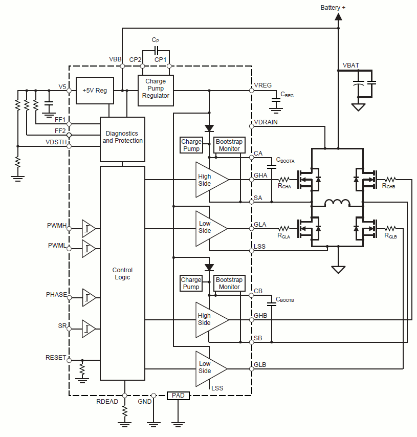 A3921 专为需要稳健控制高功率电感负载的汽车应用而设计。它具有 N 沟道 MOSFET 大电流栅极驱动、集成诊断功能,支持宽工作电压范围(5.5V-50V)。