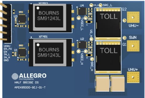 The Allegro MicroSystems Half-Bridge Driver-Switch APEK85000-GEJ-01-T is a demonstration board containing two AHV85000 + AHV85040 GaN FET driver chip sets and two GaN FETs configured in a half-bridge configuration.