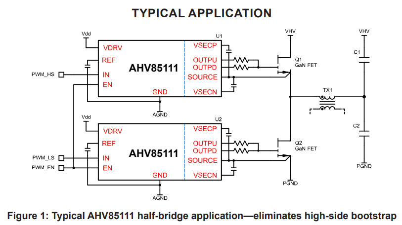 The AHV85111 isolated gate driver is optimized for driving GaN FETs in multiple applications. An isolated dual positive/negative output bias supply is integrated into the driver device, eliminating external gate drive auxiliary bias supply or high-side bootstrap.