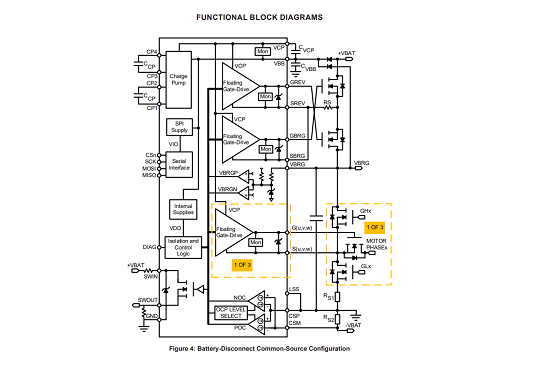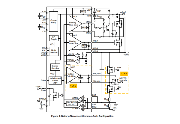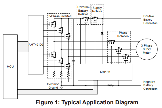 A89103 提供三个独立的栅极驱动器,可断开电机与其驱动电路的连接,从而允许辅助系统接管控制。该器件还包含用于电池断开和电池反向隔离的附加驱动器。