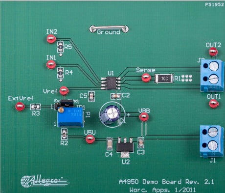 This evaluation board is used to demonstrate the Allegro A4950xLJ full-bridge DMOS PWM motor driver IC.